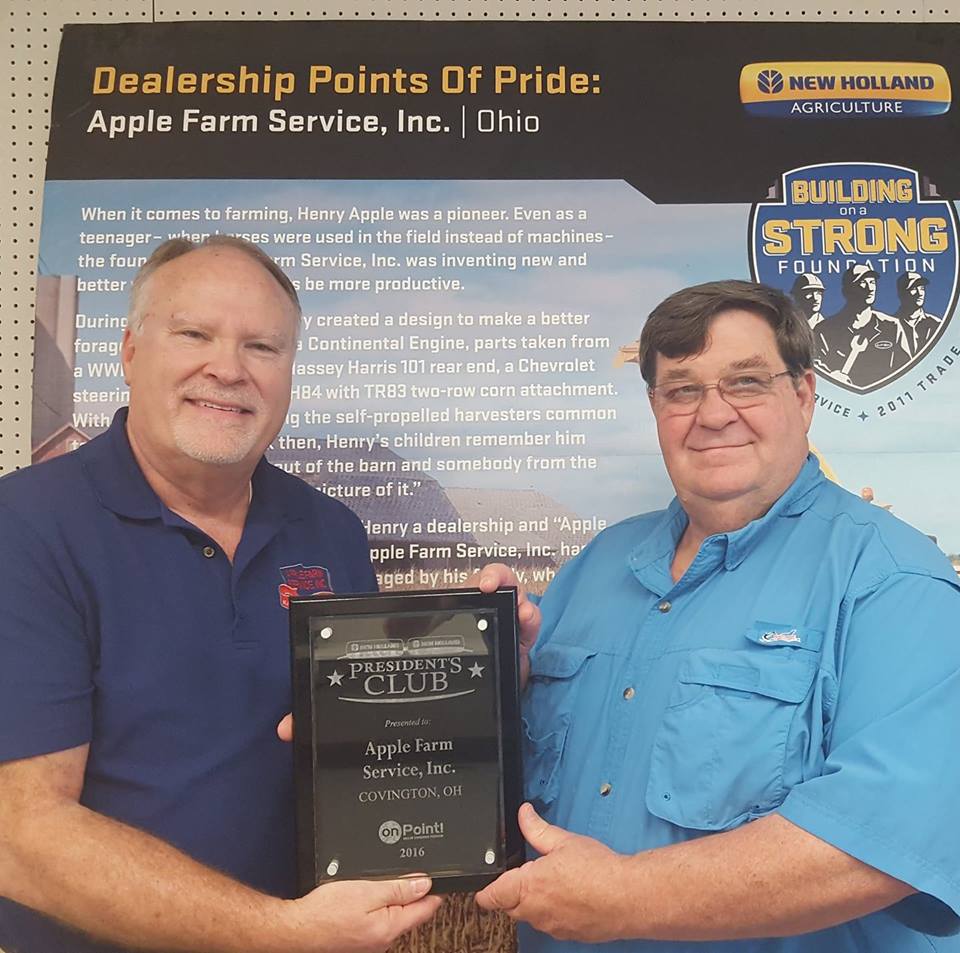 New Holland has just announced that Apple Farm Service has been awarded their most prestigious membership: the New Holland President Club. New Holland’s President Club membership is only offered to a select few dealerships that have met strict requirements. These requirements are that the dealership has demonstrated commitment to business excellence in Service, Business Management, Sales, Marketing, and Customer Focus. Each category is given a specific point score, and Apple Farm Service finished in the top 10 in total points in North America for All New Holland locations. All of Apple Farm Service's New Holland locations, Covington, Botkins, and Mechanicsburg qualified for this distinguished award.