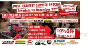 Tuesday, October 24, 2017 As you finish up harvest, give yourself a break and peace of mind. Schedule and save with the Post Harvest Service Special!