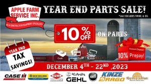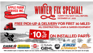 Tuesday, October 17, 2023 Call today, schedule your off-season repairs and save! Give yourself a break this winter. Let Apple Farm Service fix